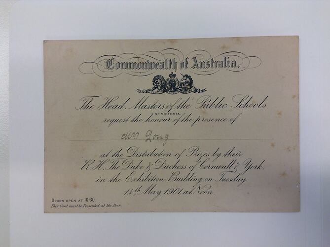 Commonwealth of Australia./The Head Masters of the Public Schools/OF VICTORIA./request the honour of the presence of/Mrs Yong/at the Distribution of Prizes by their/R.H. The Duke & Duchess of Cornwall & York,/in the Exhibition Building on Tuesday/14th May 1901, at Noon./DOORS OPEN AT 10-30./This Card must be Presented at the Door.