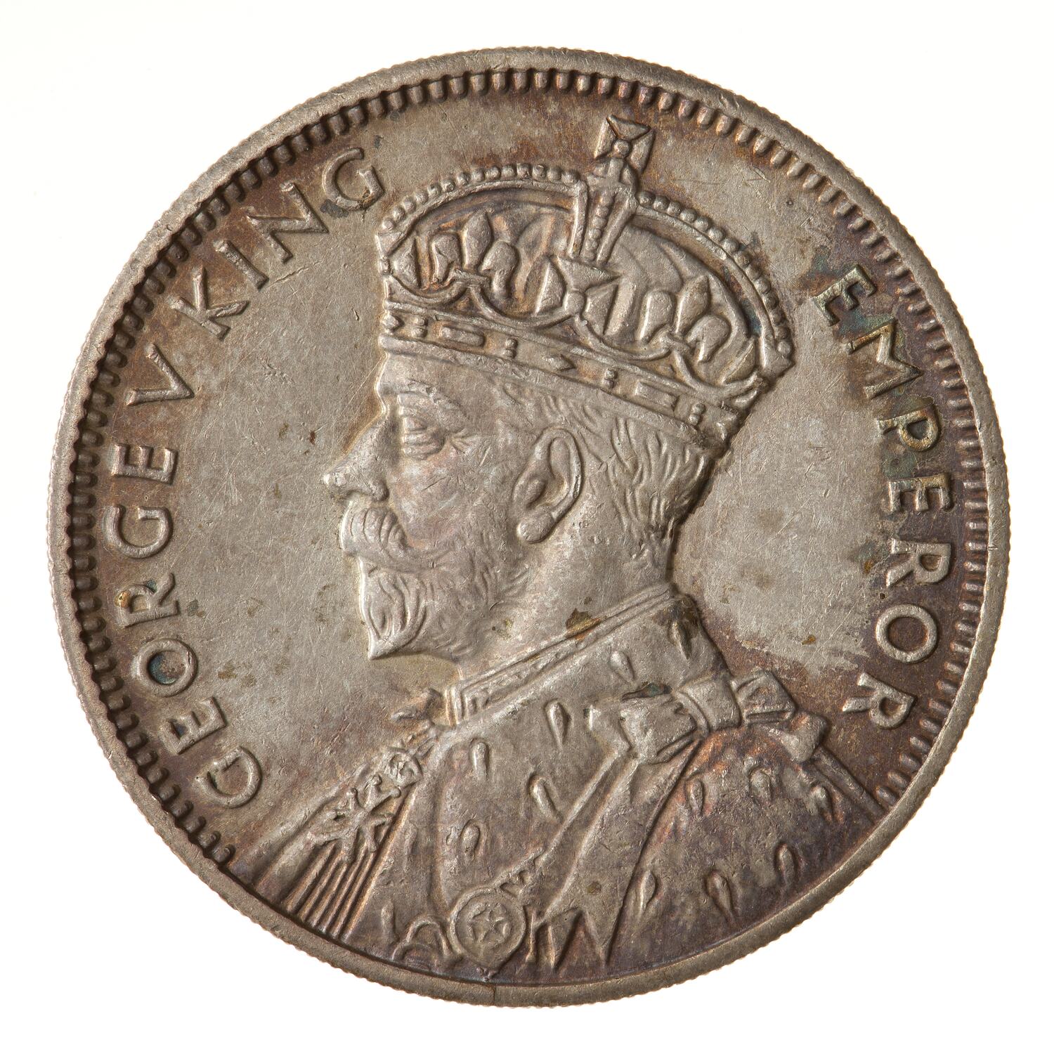 Crowned and draped bust of the King facing left and extending to the rim of the coin, the King is wearing the Imperial Crown and the ermine Robe of State and the Badge of the Most Honourable Order of the Bath; around, GEORGE V KING AND EMPEROR
