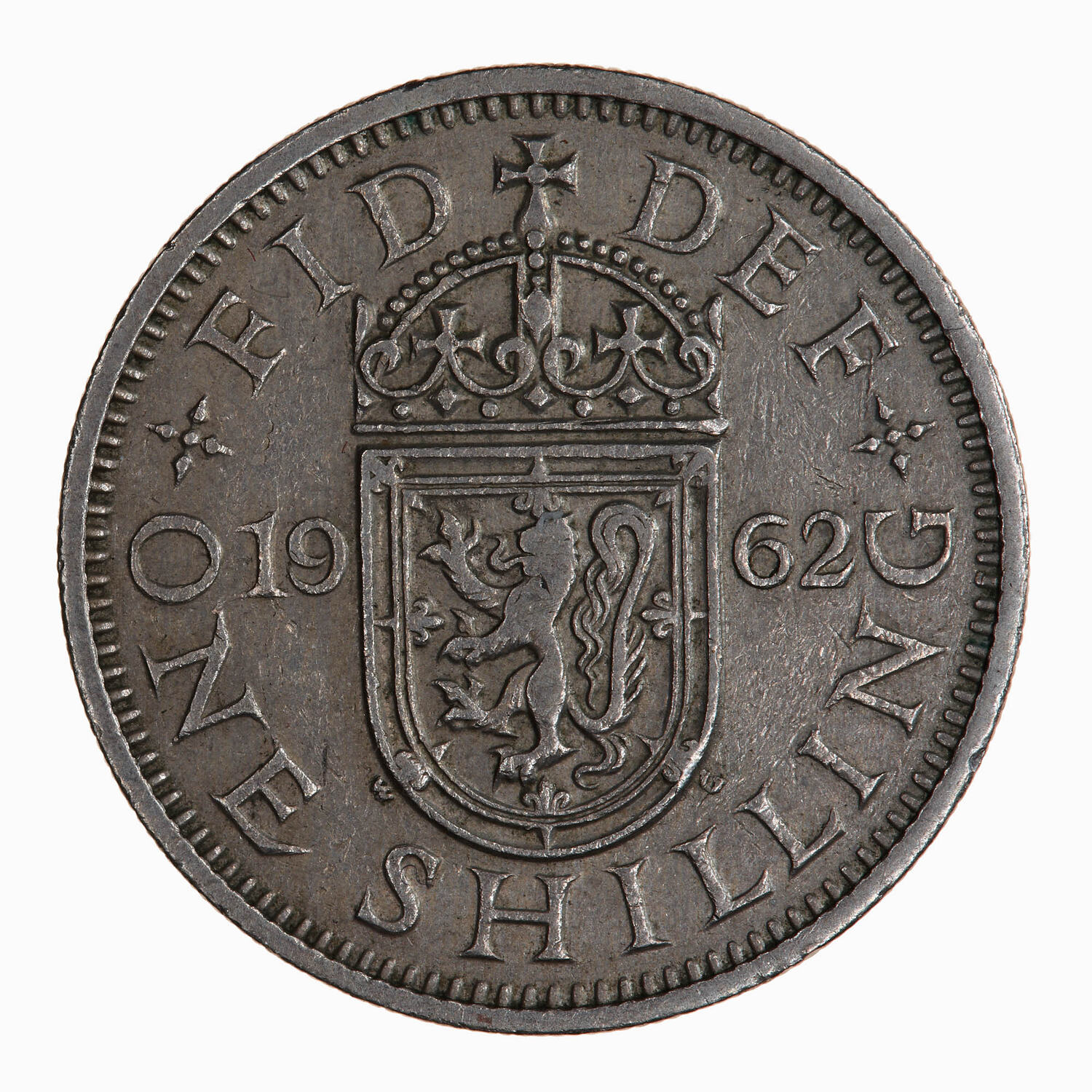 Crowned flat topped shield bearing the arms of Scotland dividing the date 1962; in small letters at lower edges of the shield the artist's initials, WG (William Gardner); around above, FID DEF; around below, ONE SHILLING