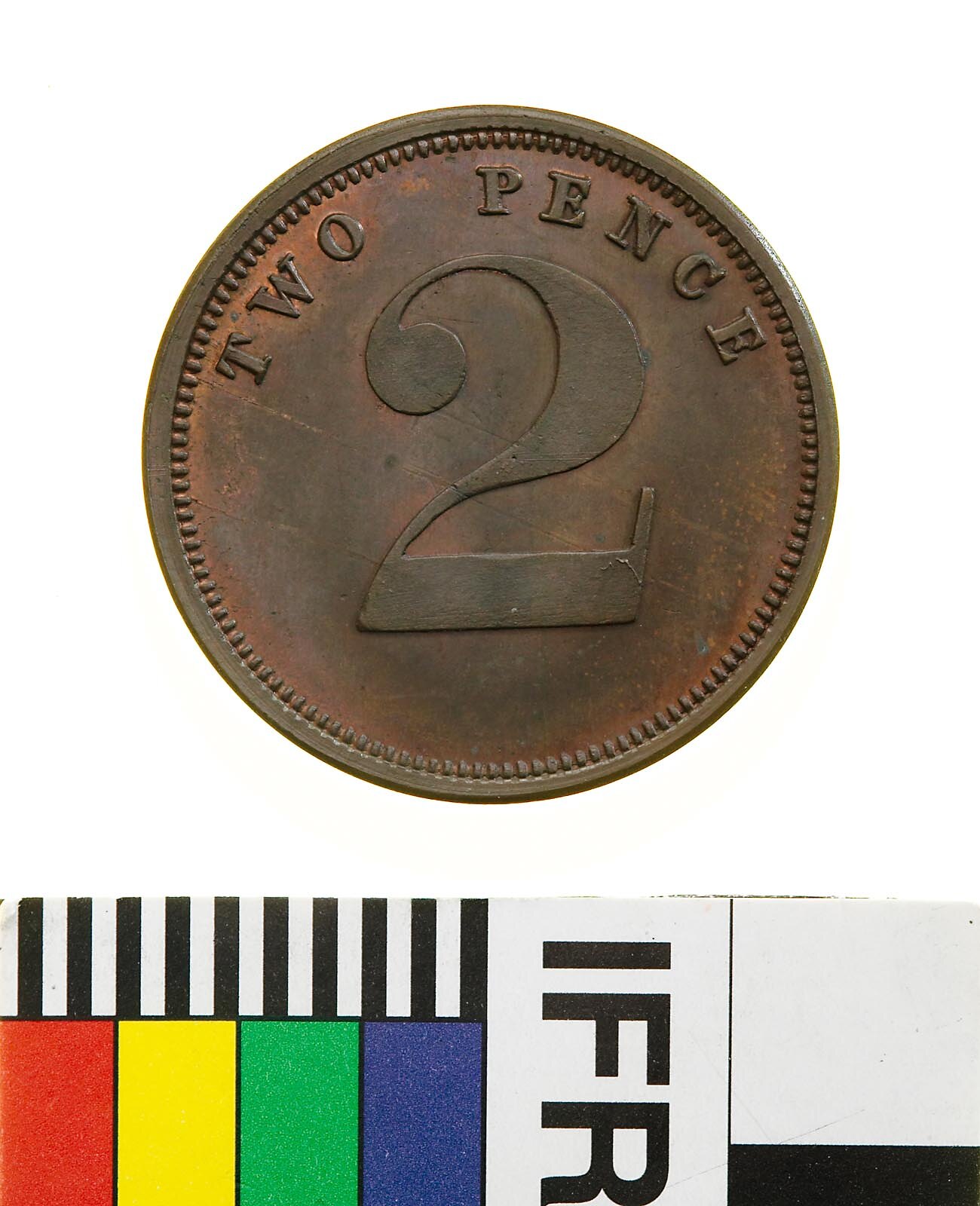 At centre on plain background a large numeral 2; around above TWO PENCE