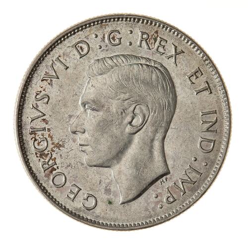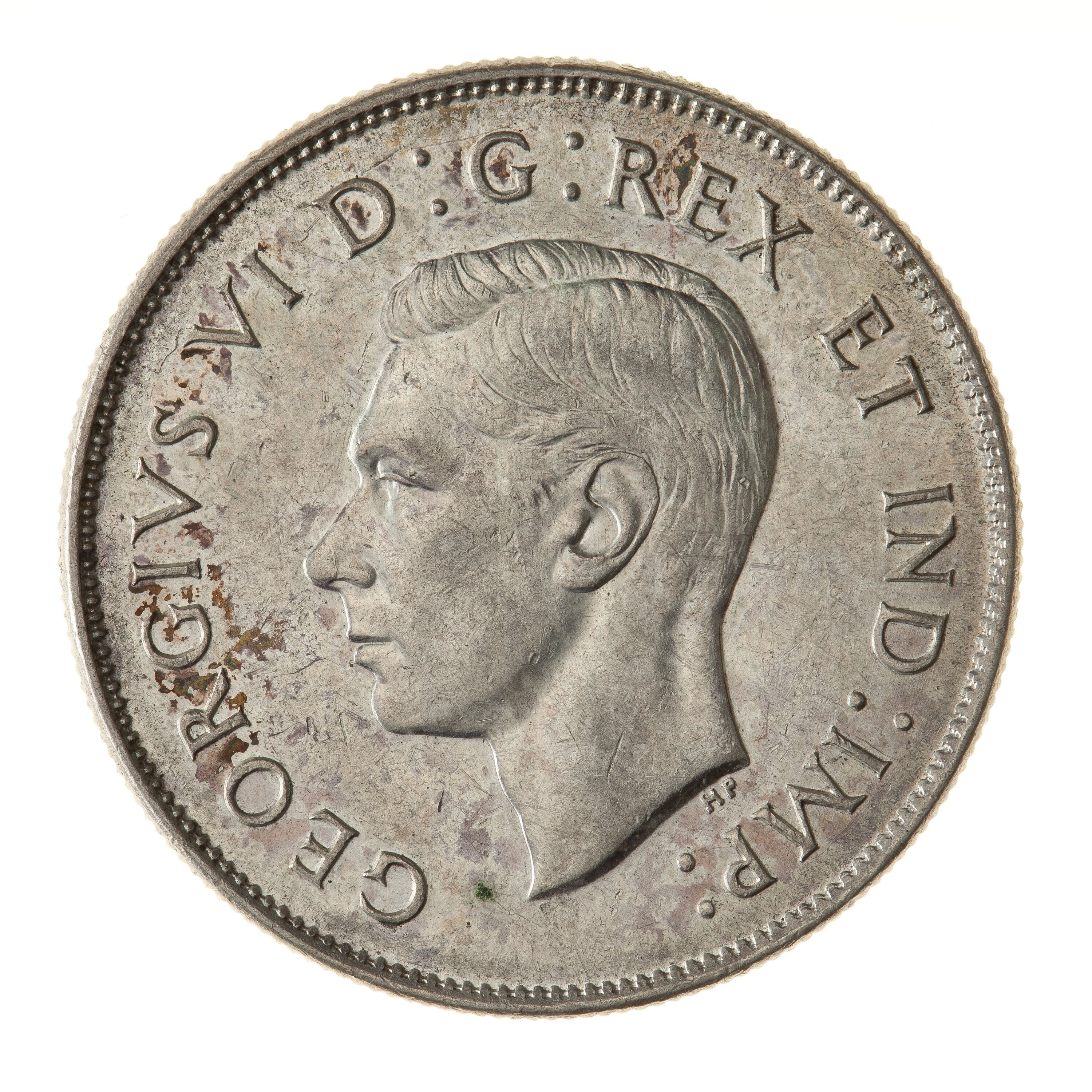 Bare head of the King facing left; around, GEORGIVS VI D : G : REX ET IND : IMP :; the artist's initials, HP, in field below neck