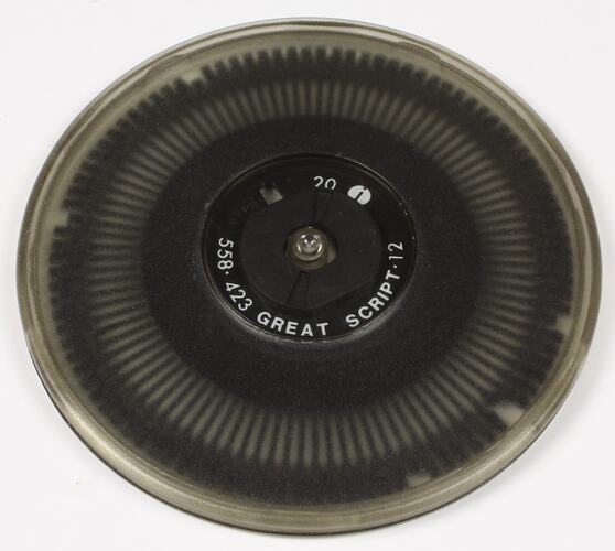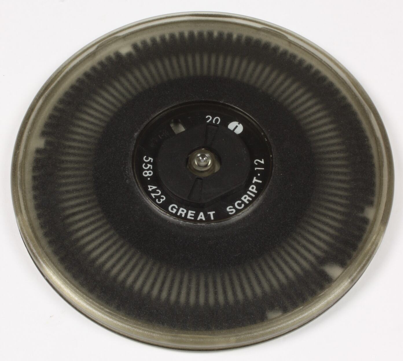 Daisy wheel for Great Script Font for an electric typewriter of the daisy wheel type, manufactured by Olympia AG of Wilhelmshaven in Germany.This particular typewriter was used as a printer attached to an Amstrad PPC640 portable compact computer, dating from about 1989.