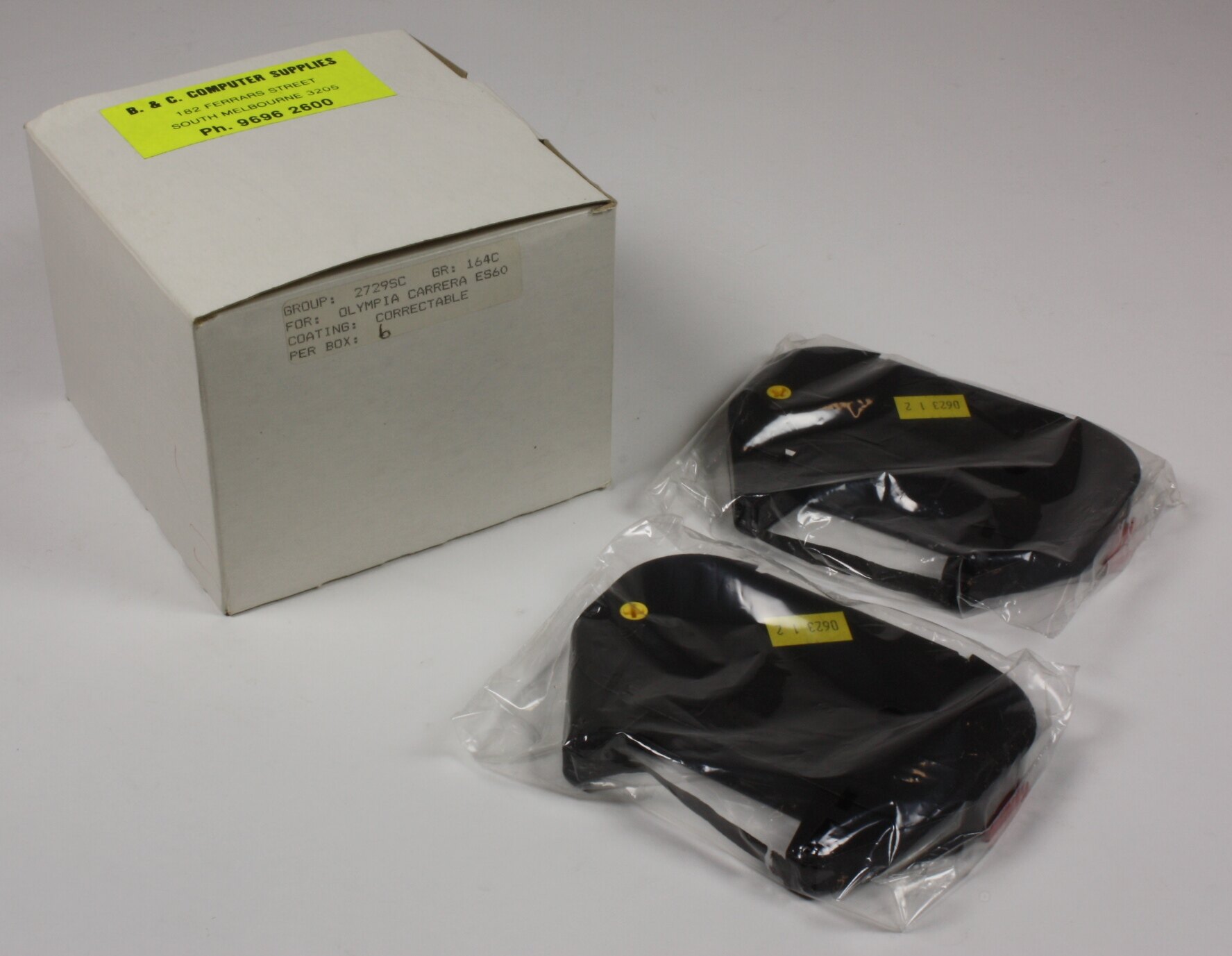 White cardboard box containing two unopened correctable ribbon cassettes. Ribbon cassettes are black with yellow and red plastic parts.