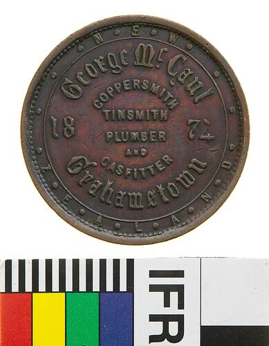 Copper One Penny Token, minted by an unknown British mint. Issued by George McCaul, Grahamstown, 1874. George McCaul was born in Perthshire, Scotland, in 1835. When the gold rushes began in Australia he travelled to Adelaide and then to the gold fields. He tried his luck again in the early 1860s when gold was discovered in New Zealand, sailing to Gabriel's Gully, near Lawrence in Otago province. He moved on to the Hokitika fields when gold was discovered there. To get there, he had to cross New Zealand's South Island from east to west. Many men died during the journey. McCaul did not have any luck at the Hokitika fields either. After abandoning gold prospecting McCaul moved to Grahamstown in Thames, in the north of the North Island, where he returned to his trade as a plumber, gasfitter, tinsmith and coppersmith.