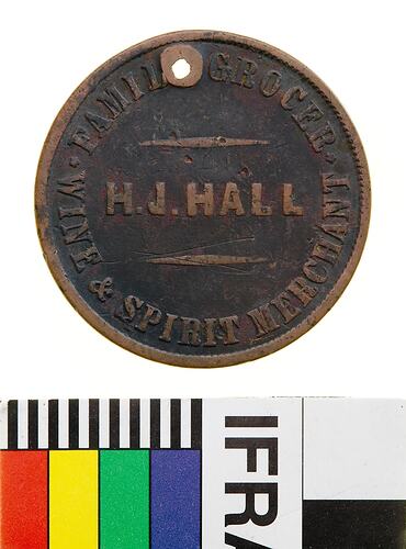 A round copper token (34 mm diameter). The token features the name and business of the issuer: Henry J. Hall, Christchurch Coffee Mills together with the denomination, one penny. The reverse repeats his name, as H.J. Hall and adds: family grocer, wine and spirit merchant. This token has been holed.