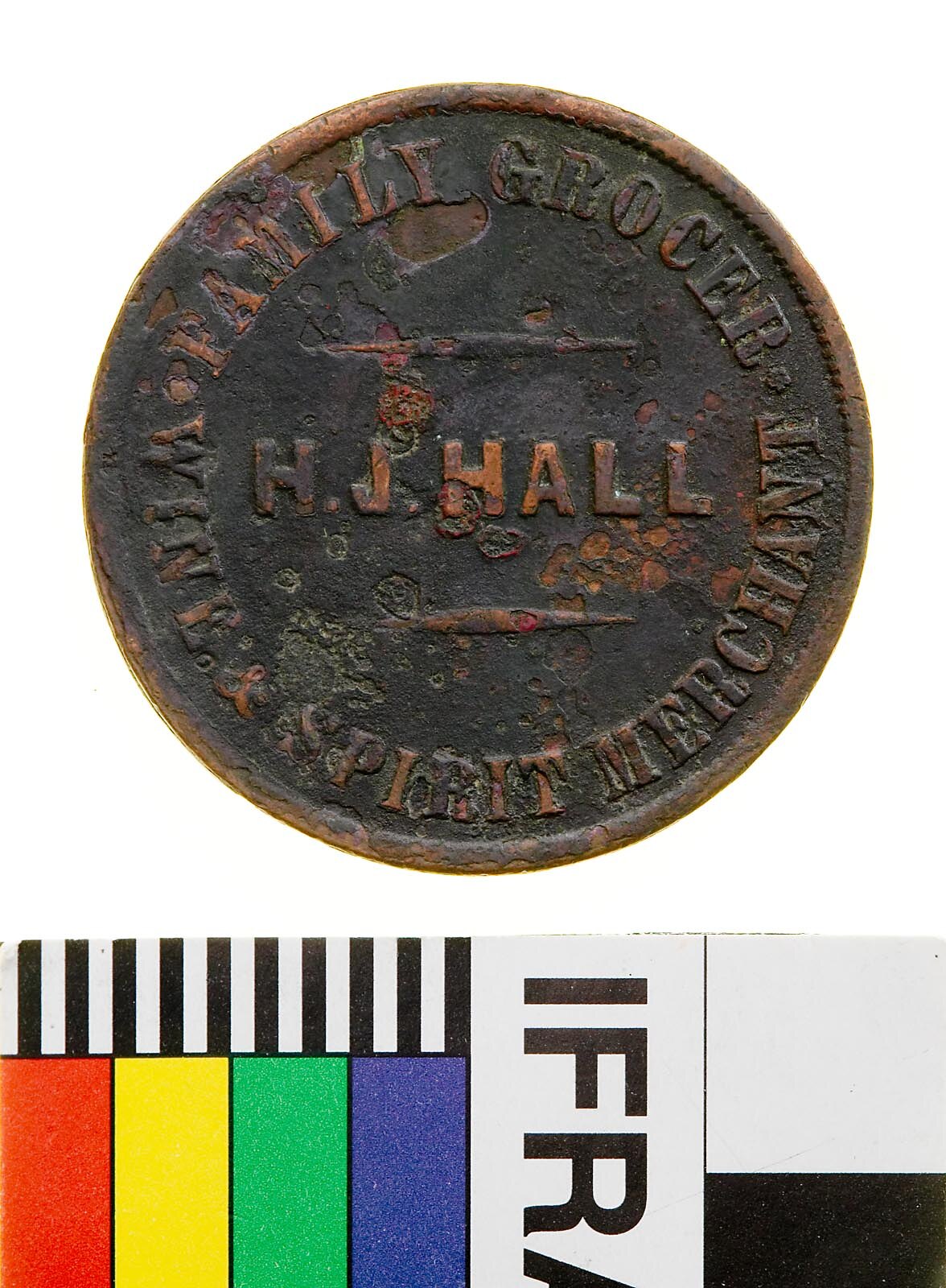 A round copper token (34 mm diameter). The token features the name and business of the issuer: Henry J. Hall, Christchurch Coffee Mills together with the denomination, one penny. The reverse repeats his name, as H.J. Hall and adds: family grocer, wine and spirit merchant. This token appears to have been buried.