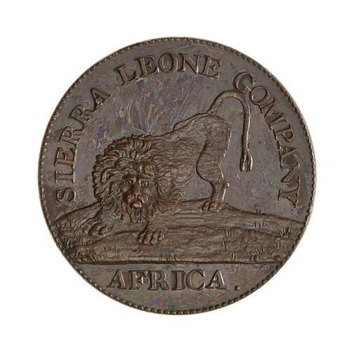 Lion on hill top facing; around above, SIERRA LEONE COMPANY; in exergue, AFRICA.