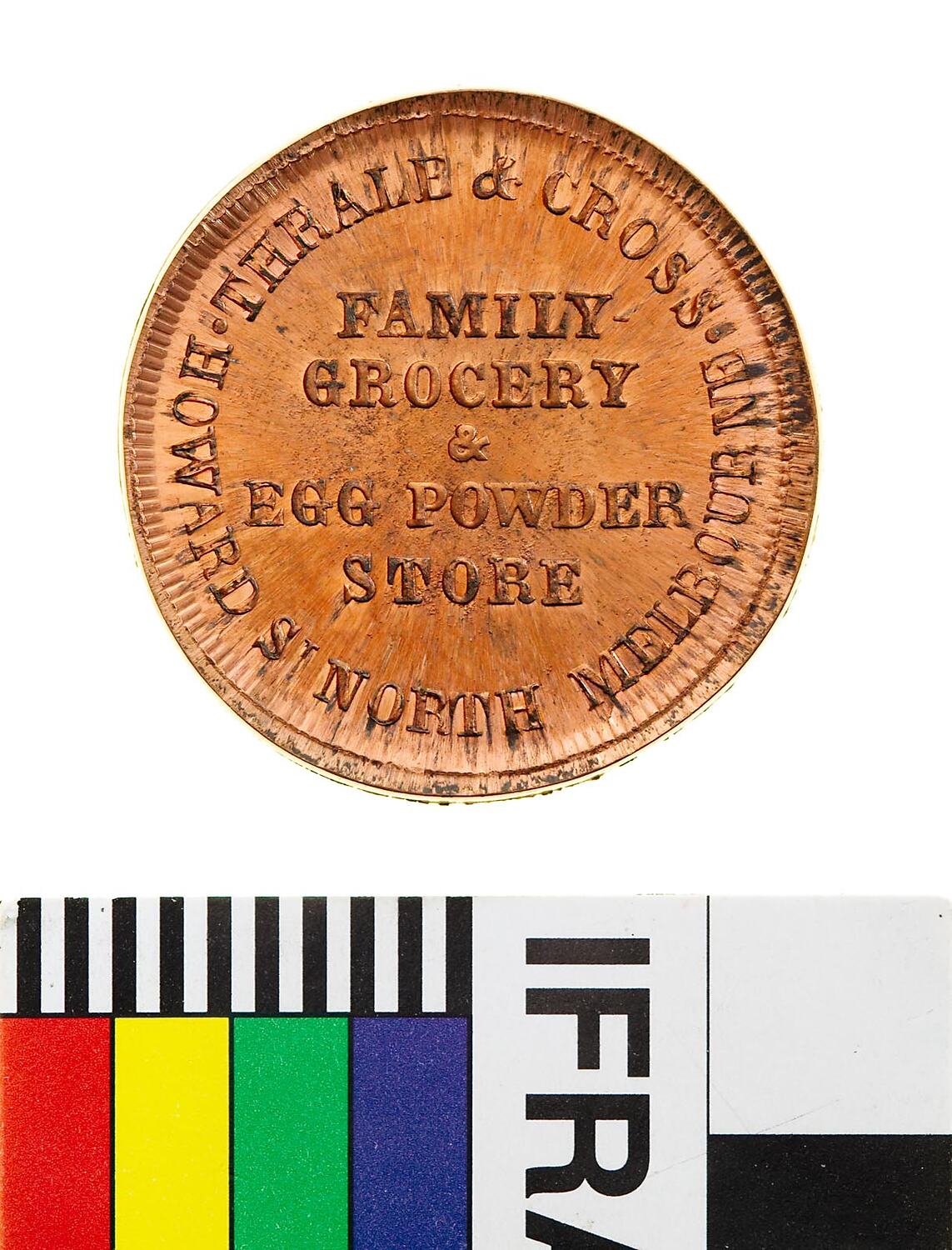 Obverse: THRALE & CROSS FAMILY GROCER & EGG POWDER STORE HOWARD ST. NORTH MELBOURNE