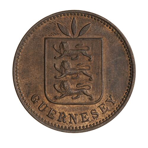 States of Guernsey shield of arms, 3 lions; around below, GUERNESEY