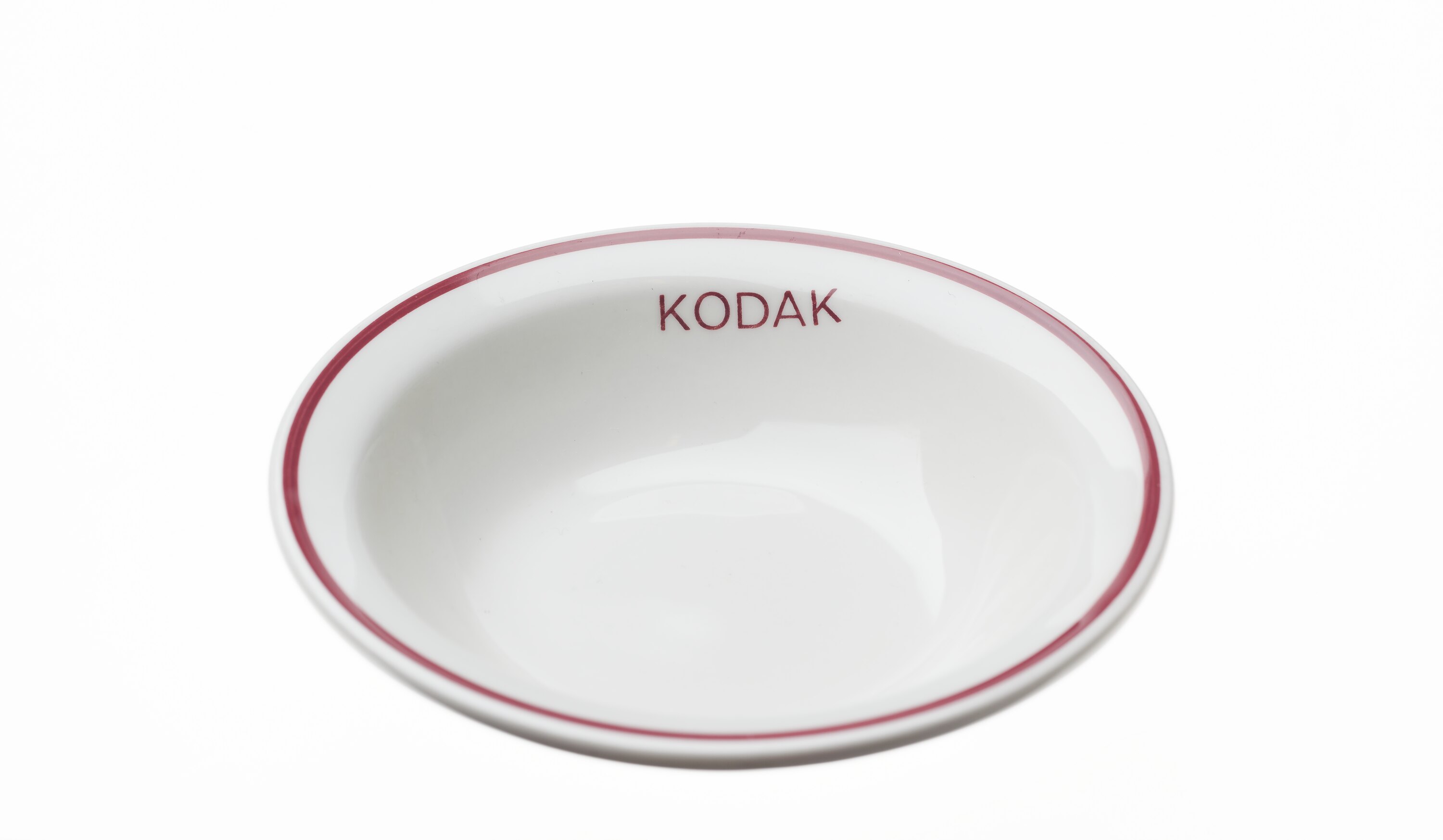 Small white bowl with burgundy line running all around the lip. The word KODAK, also in burgundy, is just inside the lip. The maker's stamp is on the bottom of the bowl.