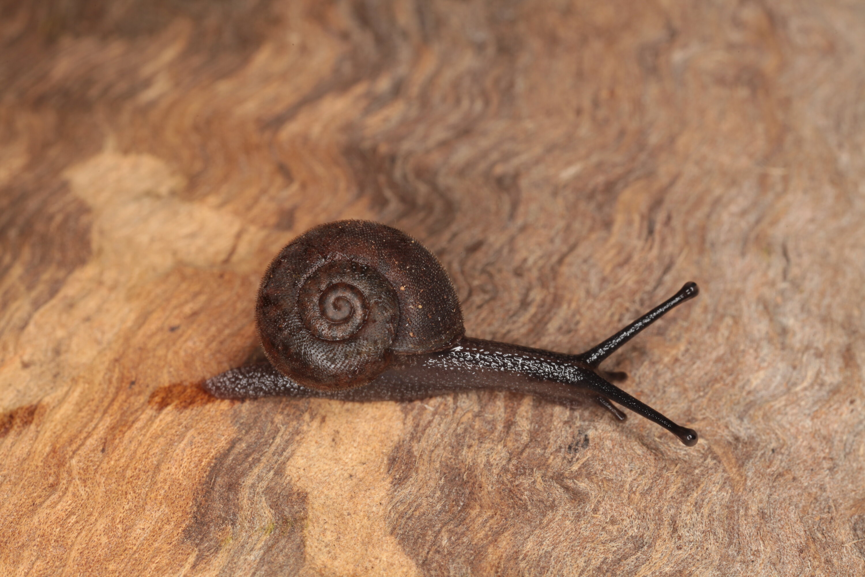 A small narrow-bodied snail with dark brown flattened shell covered in fine bristles.