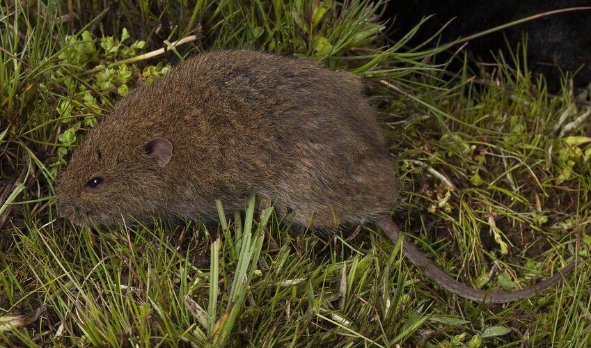 Fluffy dark brown fur paler underneath, short tail darker on top than underneath, dark feet, wide blunt head, stocky body, broad teeth, tuft of hair inside ear.