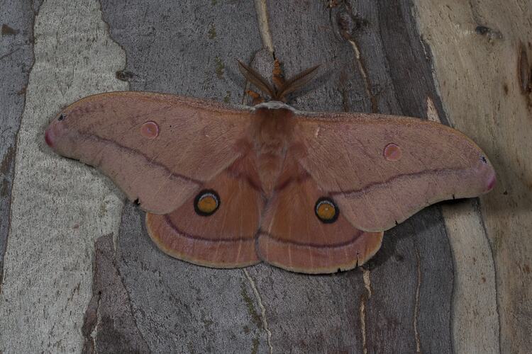 Forewings are brownish orange with pink wingtips and have a prominent central eyespot. Between the eyespot and the outer edge of the forewing there is a pale crosswise line. The line is well removed from the eyespot. The hindwings are smaller but similarly marked, though the eyespot is double the size and even more prominent. Males have feathery antennae. Females are larger than the males and have broader wings. Wingspan ranges from 11 cm to 18 cm. Caterpillars dark in early stage becoming green as they grow. This species can be separated from the similar, though smaller, Emperor Gum Moth where the crosswise line on the forewing usually just touches the eyespot.