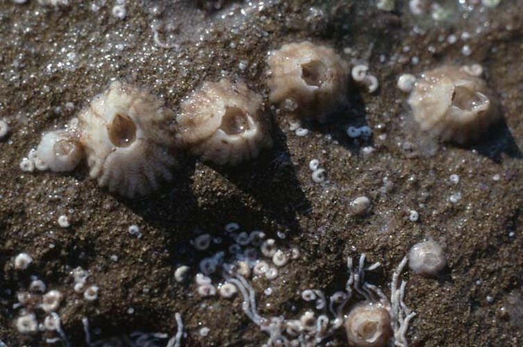 Four side plates, forming a wide conical shape. Colour varies from grey-white plates with pink tips in young animals, to pink in older animals. Opening pentagonal shape. Differs from Tesseropora rosea by preferring sheltered areas on the shore and having a more regular conical shape. Up to 1 cm high, 2 cm wide.