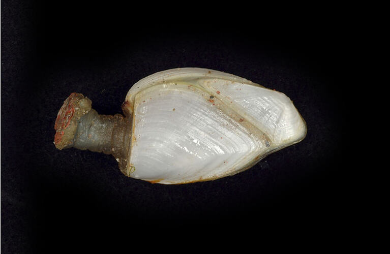 A stalked barnacle with five side plates. Plates finely ridged and white with orange outline. Stalk shorter than length of plates. Plates up to 4 cm long and 25 mm wide, stalk up to 2 cm long.