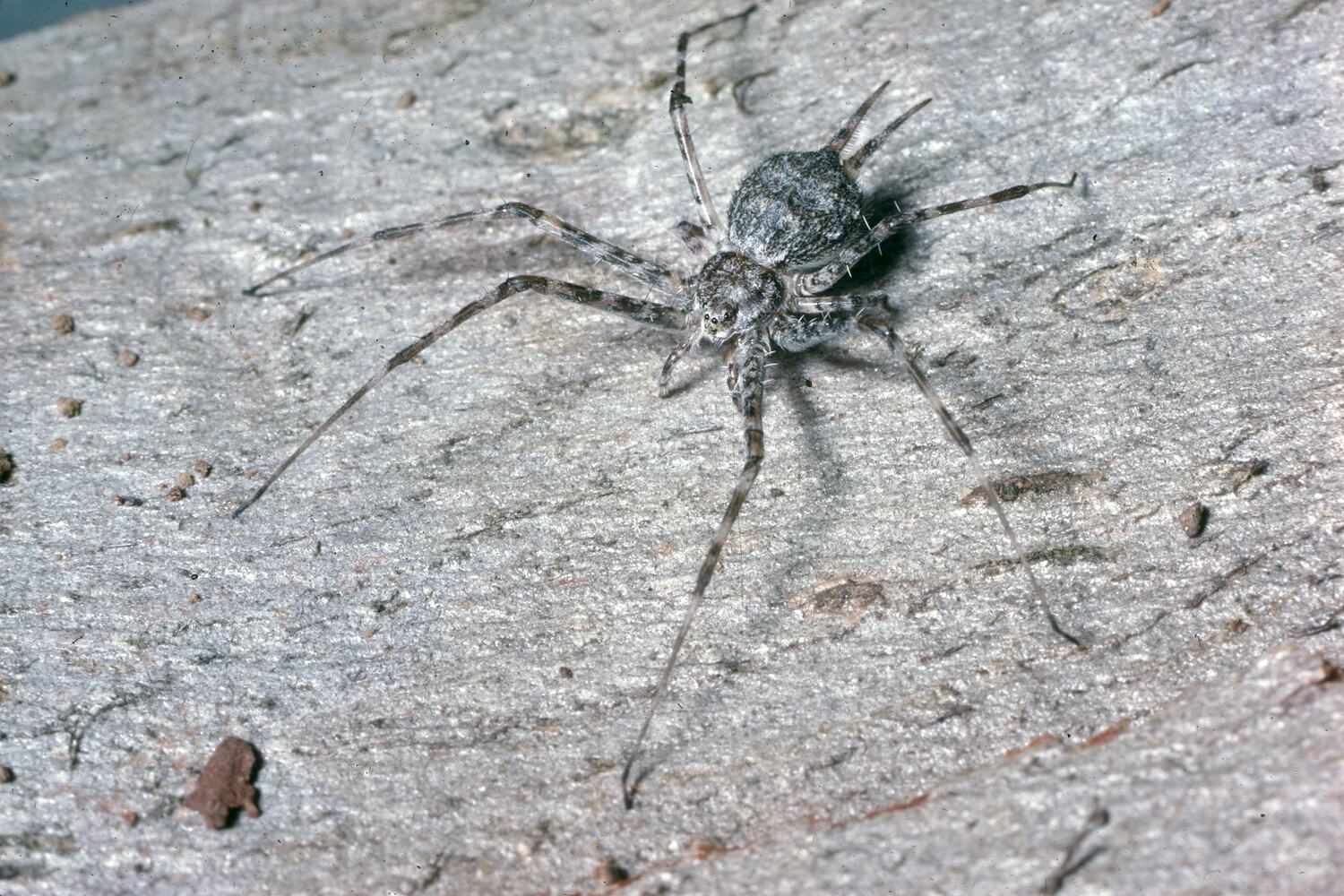 Flat spiders, cryptic coloration, two long spinnerets projecting from posterior of abdomen.