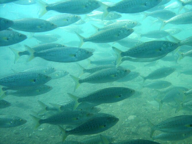 Elongate body, dark blue-green above, silvery to white below, yellow pectoral fin, dark edge on tail fin.