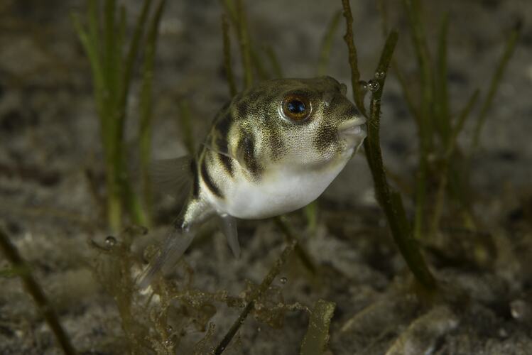 Body robust, somewhat rounded, densely covered by small spines that extend onto tail base; dorsal and anal fins reaching or almost reaching tail base; lower edge of eye well above pectoral-fin base. Pale grey to yellowish above, with indistinct grey to medium brown spots on back and upper sides behind pectoral-fin base; light grey on top of head to upper lip and down both sides of eye, sometimes merging on cheek; no spots on belly. To 25 cm.