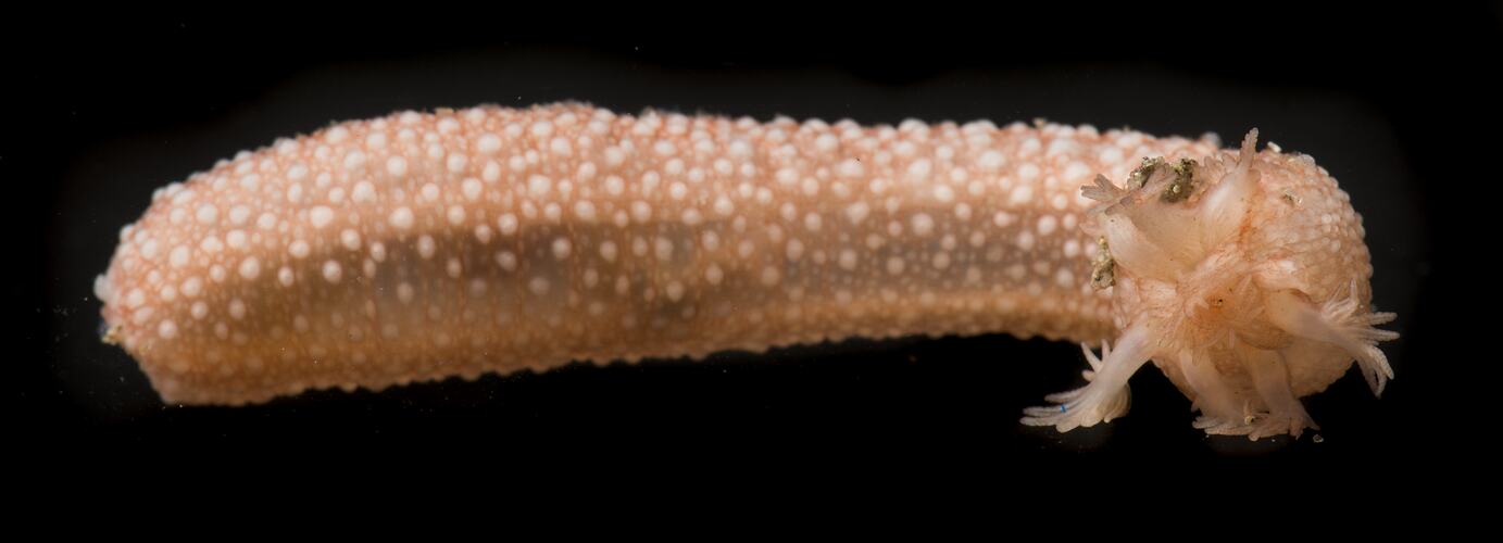 Body large and worm-like. No tube feet. Orange, pink or red with conspicuous white spots. Up to 25 cm long.