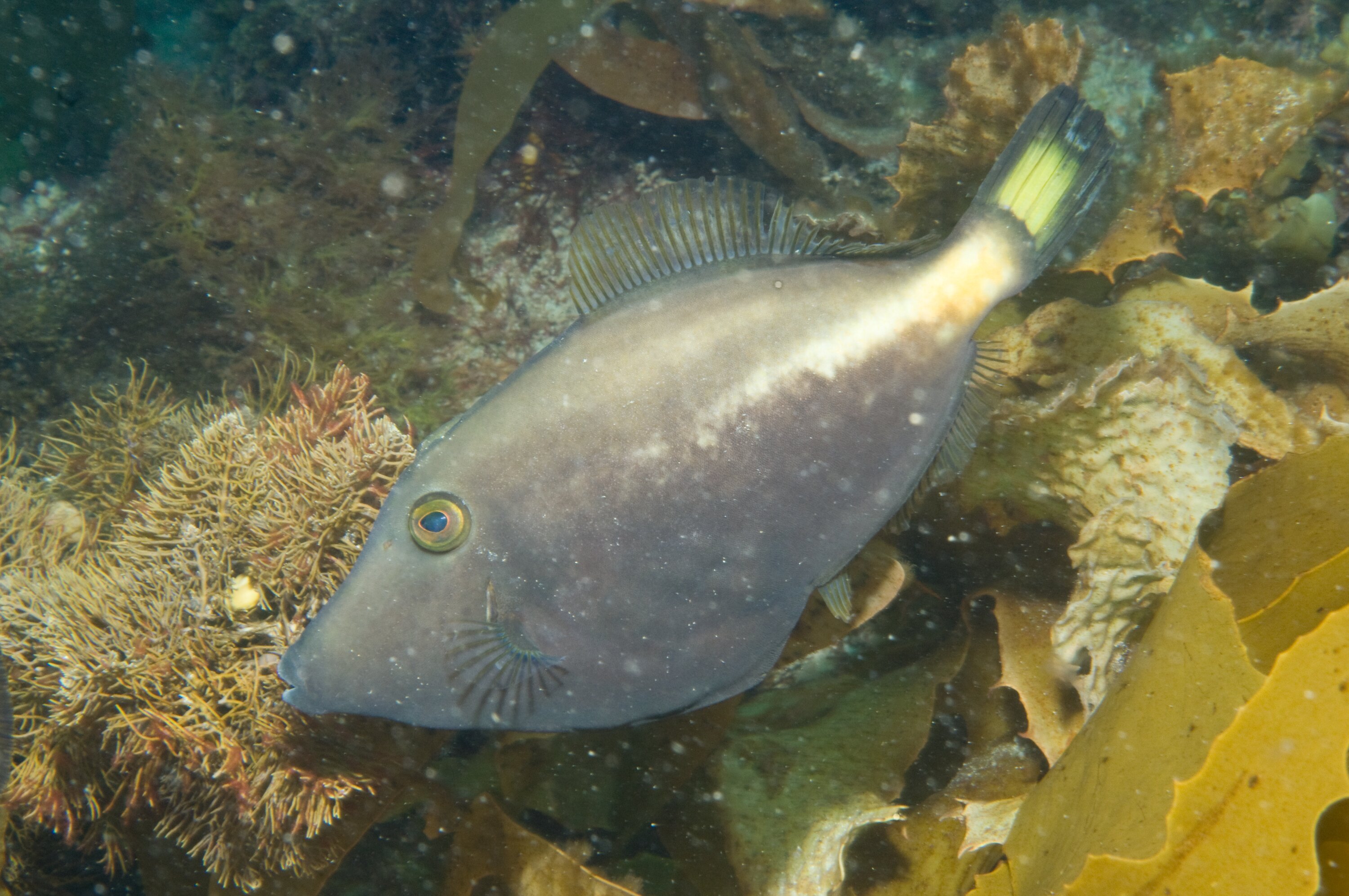 A blackish to greenish brown leatherjacket, with a large yellow or orange blotch on the tail base, often continued as a yellow stripe along the midsides. Males have a patch of fine bristles and two pairs of large spines on the tail base. Females and juveniles lack the bristles and the spines are small to minute. To 30 cm long.