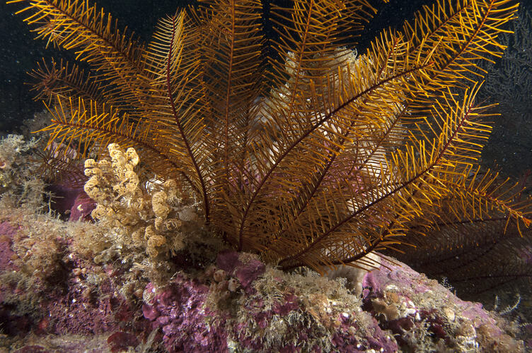 This is the most conspicuous species of crinoids in southern Australia. The body is usually kept hidden in a rock crevice, with only the long arms reaching out into the water to feed.