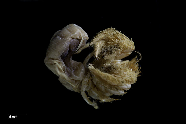 Lives in shell. Claws with dense setae covering red-tipped spines; rostrum narrow, exceeding lateral projections. Moveable plate attached to base of eye stalks with about 4 apical spines.