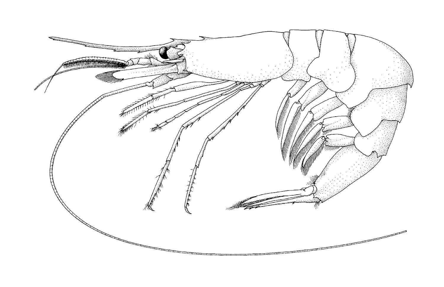 Unlike other southern Australian members of the family Pandalidae that are large oceanic midwater shrimp, the Slender-beaked Shrimp are benthic on the shelf or coastal algal dwellers. The shrimp is semitransparent but spotted. Its only claws, on the second pair of legs, are microscopic. This common delicate, semitransparent species was figured in 1927 as Parapandalus leptorhynchus.
