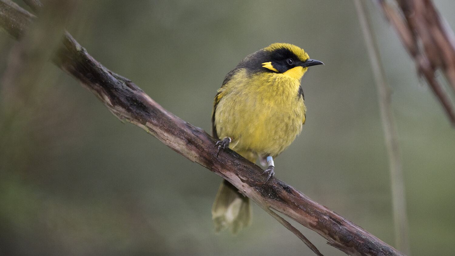 The Helmeted Honeyeater is Victoria's bird emblem and is endemic to Victoria: it lives in Victoria and nowhere else. A subspecies of the Yellow-tufted Honeyeater, it is critically-endangered and restricted to the Yellingbo Nature Conservation Reserve. Fewer than 100 birds remain in the wild. They are aggressive birds, fiercely defending their territories. They breed from July to March, usually producing 3 clutches per season and 2 eggs per clutch. The females build the nests and incubate the eggs, but both parents feed the chicks. The cup-shaped nests are made of grass and bark bound with spider webs and lined with soft material. They gather most of their food from eucalypt trees, feeding on invertebrates, lerps, nectar and manna (sap). They also eat berries and honeydew. Their main threats include habitat degradation, predation by introduced species, and competition with other species, particularly Bell Minors.