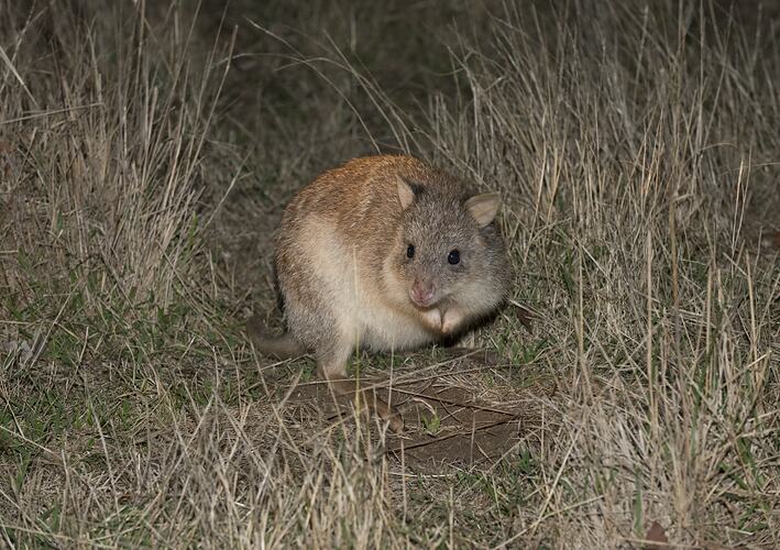 A solitary species that shelters during the day in 'nests', shallow excavations with a dome of fibrous vegetation across the top and a single entrance. Multiple nests are often used by the same individual. They usually emerge shortly after dark to forage and primarily eat herbs, roots, tubers and fungi. They can cover large distances when foraging (2-4.5 km). Females are continuous breeders, with sexual maturity reached at around 11 months. Females raise one young per pregnancy, but exhibit embryonic diapause (the delaying of an embryo's development) and can have 3-4 young per year. Since European settlement numbers have declined with some populations becoming extinct. The main causes of these declines are predation by the red fox and domestic cat, competition with rabbits and the loss of suitable habitat for agriculture.