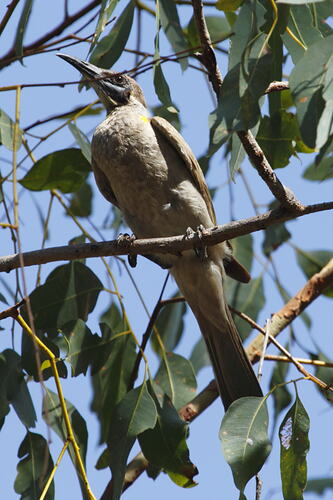 Friarbirds belong to the honeyeater group of birds and are characterised by bare grey skin around their face and head. Little Friarbirds are the smallest of the friarbirds and have the least bare skin on the face. They have grey-brown upperparts and pale grey underparts with greyish-blue bare skin around their eyes and cheeks. They also have a longish curved bill. Body size 25 to 29 cm.