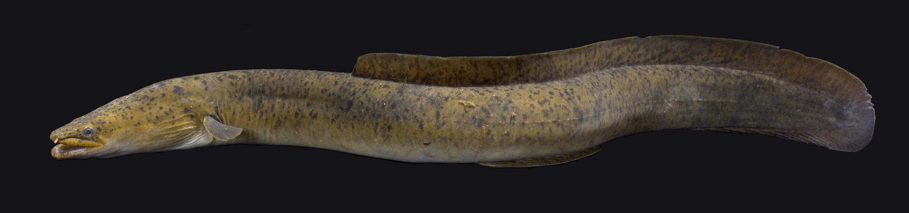 Large slender, cylindrical eel with broad head and large mouth extending just beyond the eye.