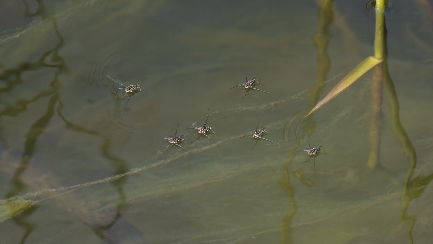 Water striders can skate, glide or jump across the water surface. They often gather together in groups or 'schools'. This social behaviour may help individuals capture prey, such as emerging aquatic insects or terrestrial insects that have become trapped in the water by the surface tension. Schooling may also increase the chances of finding a mate and avoiding predators. They propel themselves over the water surface using modified leg strokes of their middle and hind legs.