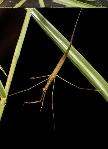 Water Stick Insects are sit-and-wait predators. They hide in submerged vegetation with their head and front legs hanging downwards. Their respiratory siphon protrudes through the water surface so they can breathe. They can sense vibrations given off by their prey which they grab with their front legs. They eat a variety of aquatic prey, often mosquito larvae and even tadpoles. Eggs are usually laid in slits made by the female in floating plants.