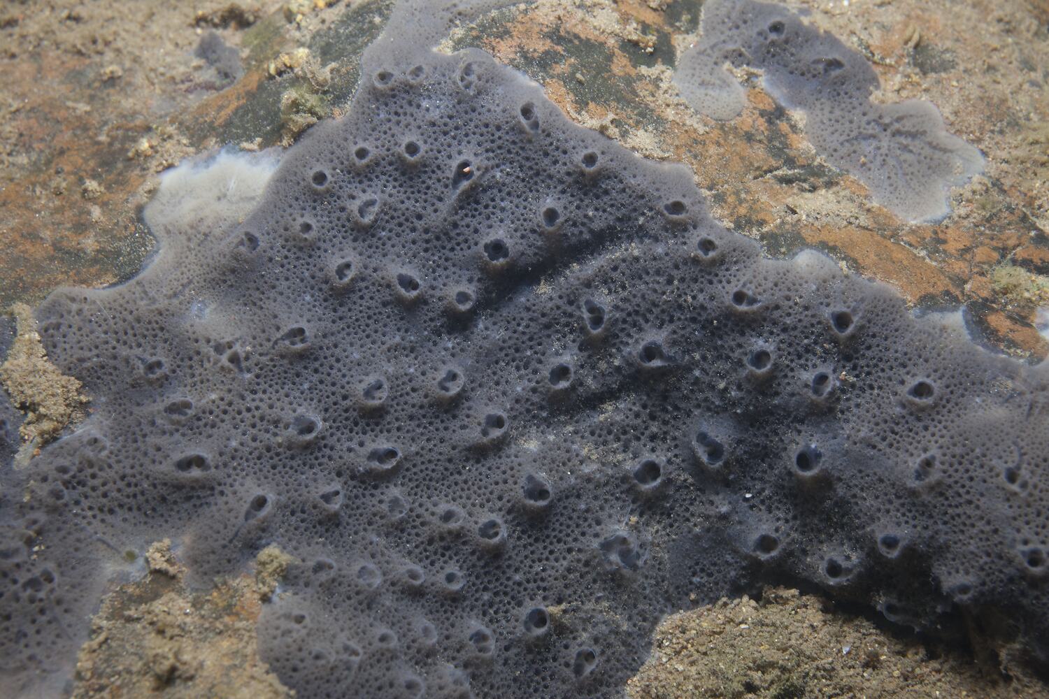 Encrusting sponge forming a typically grey layer over underwater rock faces.