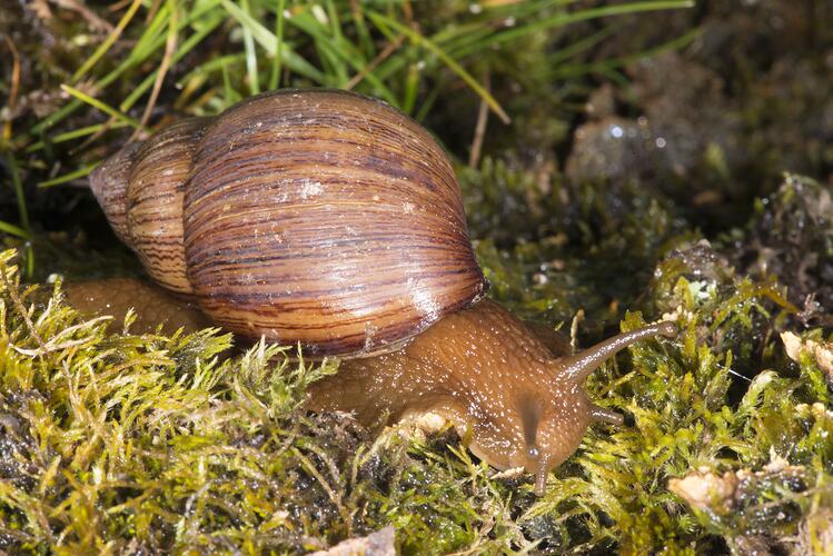 A robust snail with a large elongated brown shell with darker streaks and zig-zag patterns.