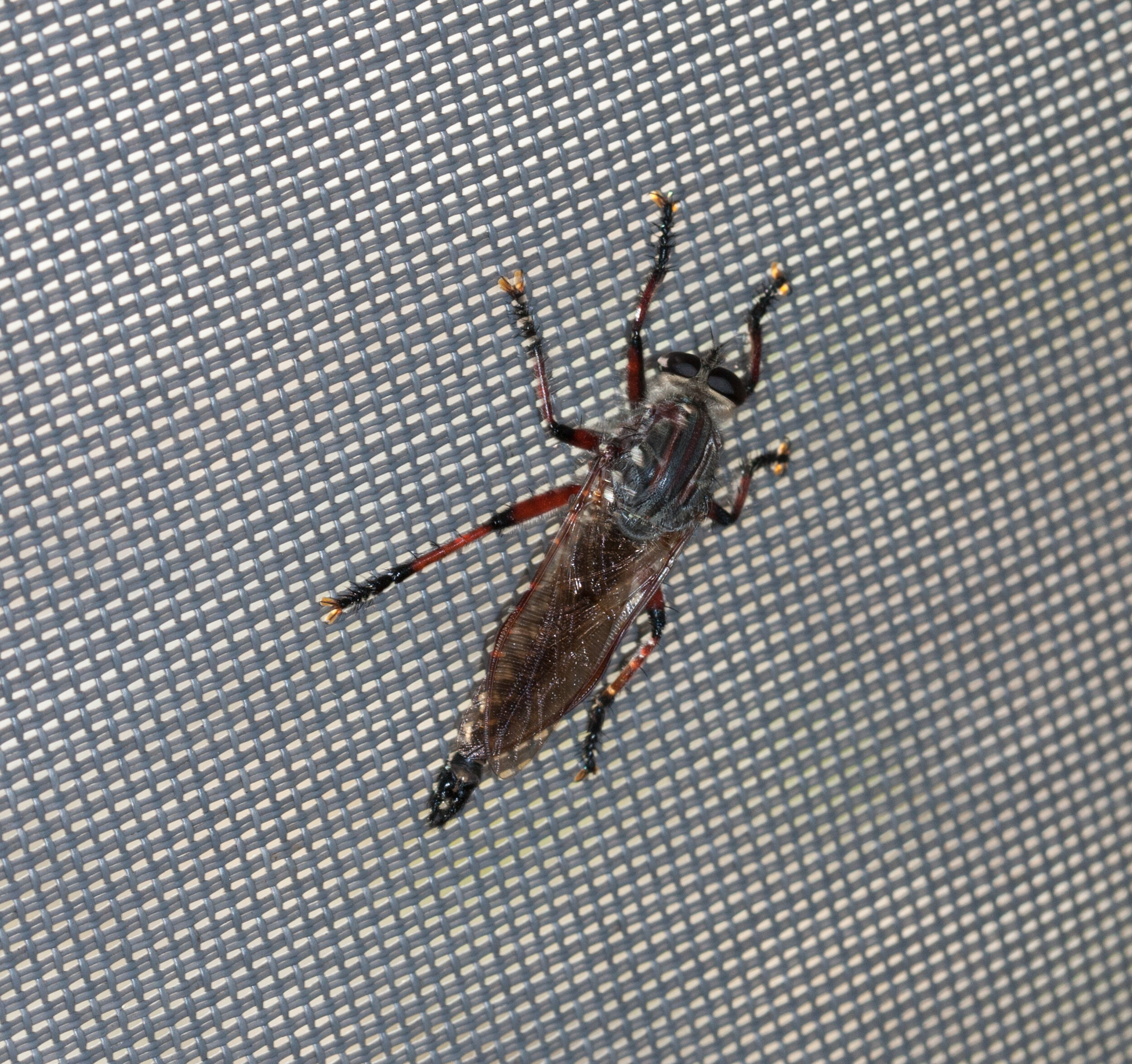 A powerfully built, bristly fly with a short, stout proboscis enclosing the sharp sucking tube. Robberflies are aggressive predators.