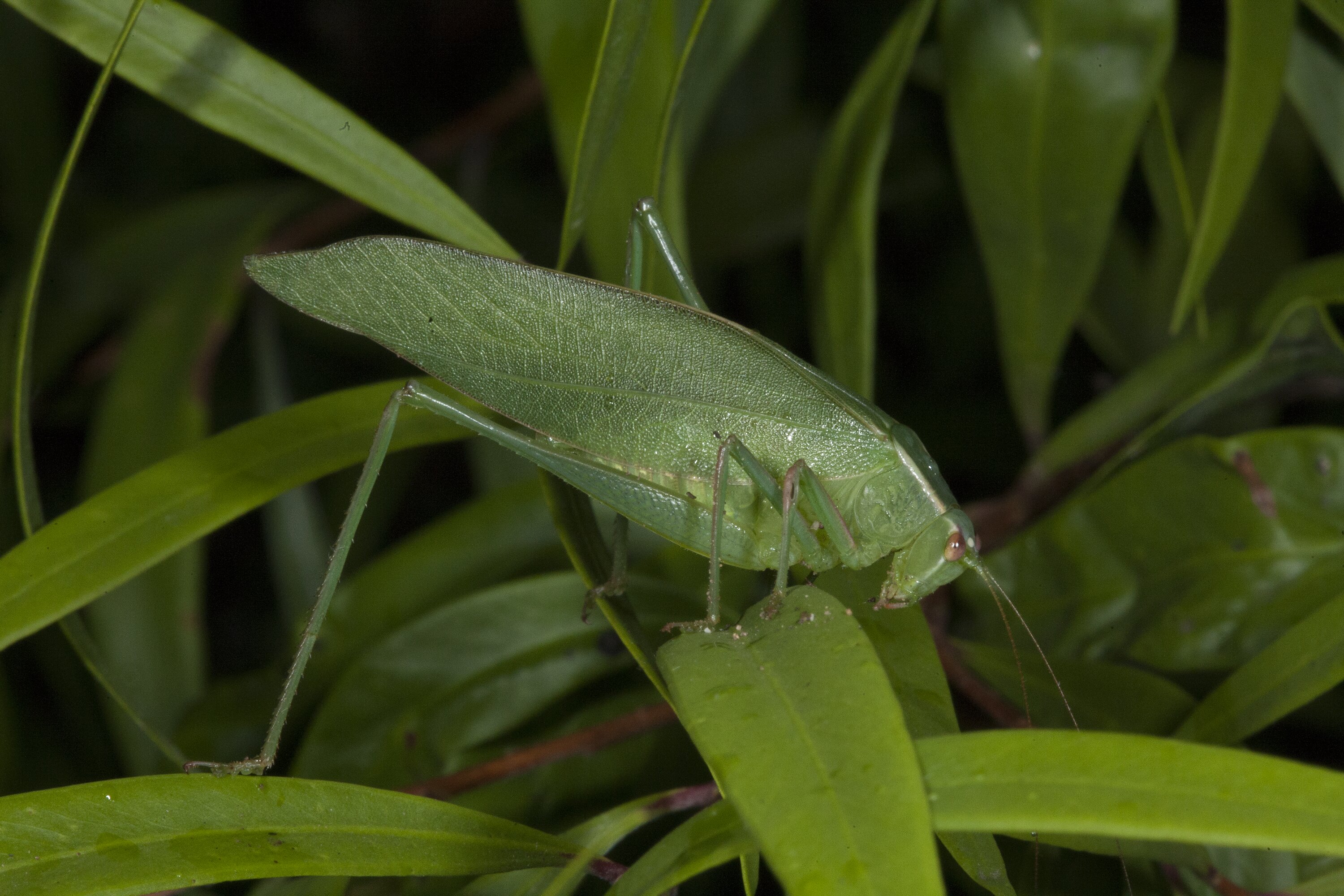 Insects in the cricket family Tettigoniidae are commonly called katydids or bush crickets. Adults and nymphs are primarily herbivorous, eating young foliage and petals. They seem to match their colour to suit their background (or vice versa), and rely on their camouflage for protection; they can also use their powerful hind legs to jump out of danger's way. Males have stridulatory organs on their wings, producing an audible but feeble chirping call on warm evenings to attract mates. The female uses her ovipositor to lay eggs in plant-stems.