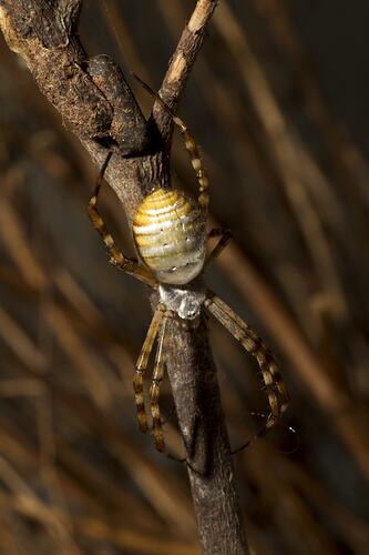 Carapace (the hard shell-like covering over the front part of the spider) silver-white, abdomen oval and pointed towards the rear. Female abdomen shimmery white and yellow with darker horizontal lines, long legs banded black and brown. Male abdomen shimmery white with gold highlights, legs unbanded light brown or yellow. Body length: female 10-26 mm, male 4-6 mm.