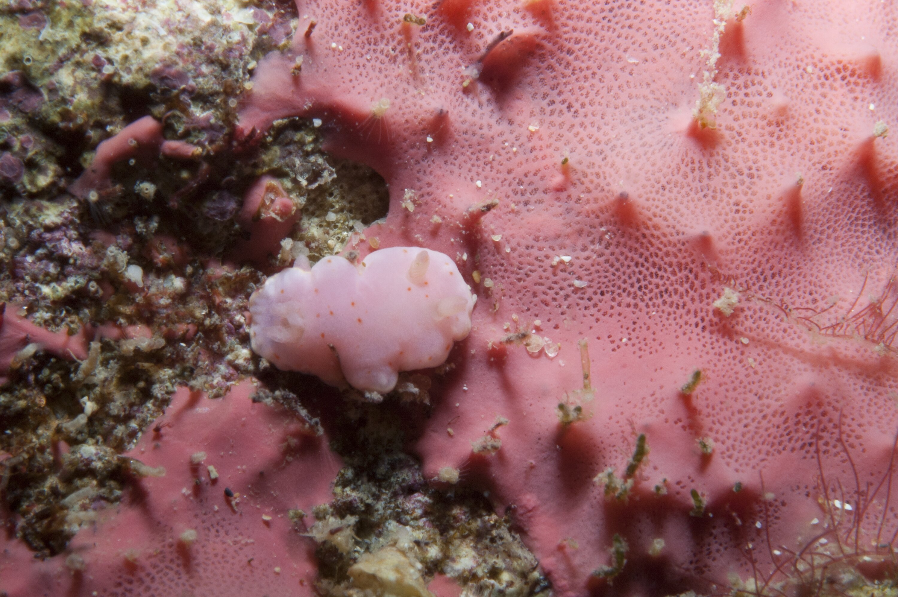 A pink sponge species with encrusting form. Size of about 30 cm.