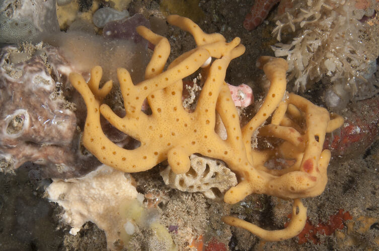 A pale yellow sponge species with ramose (branching) form. Size of about 20 cm.