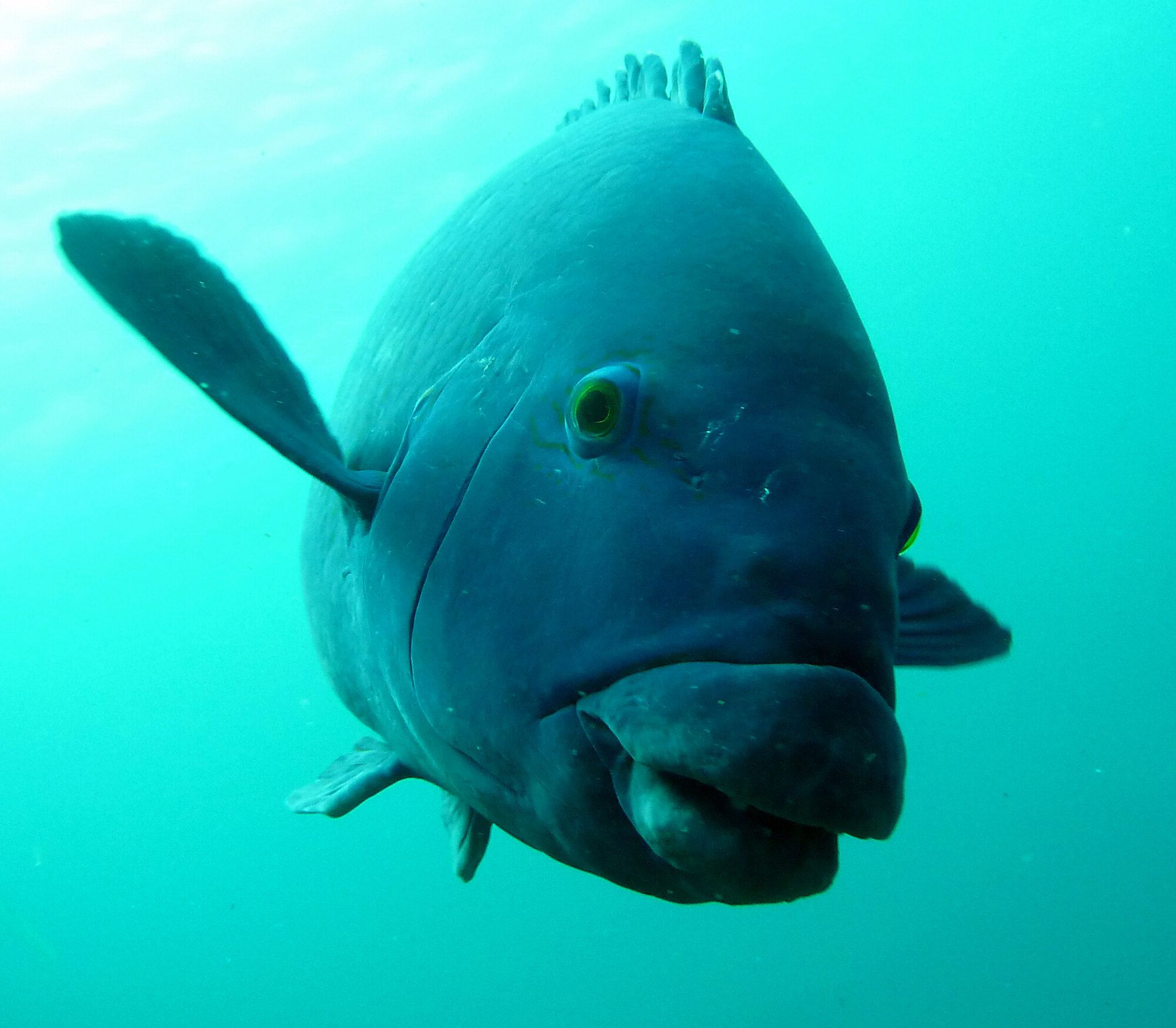 A large stocky wrasse with a single long-based dorsal fin, a large almost square tail, thick fleshy lips, large heavy scales and peg-like teeth. Adults have a hump on their forehead. Adult males are bright blue to greenish-blue while females are typically reddish-brown to brown, often with random pale spots or blotches. Juveniles are greyish or greyish-brown with spots or blotches. To 1.2 m and a weight of 18 kg.