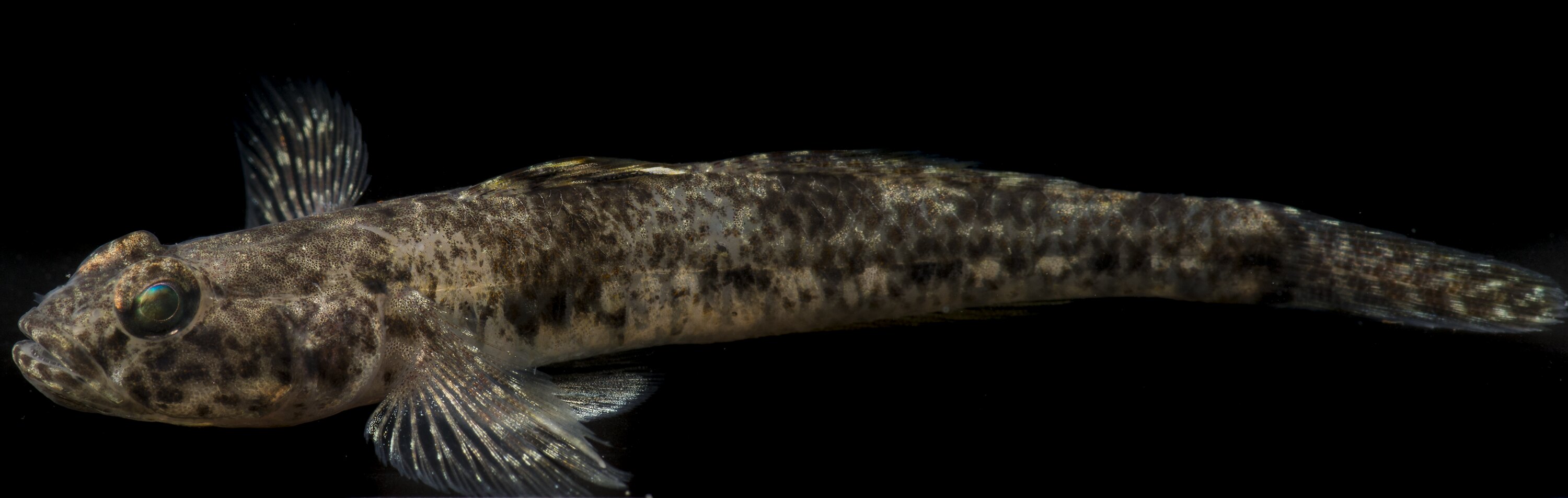 Broad head with bulbous cheeks, large mouth and eyes close together near the top. Body is brown to grey, paler below and often with a row of dark blotches along the sides. Has three to five dark brown saddle-shaped marks across the back and bars across the back of the head. Males are larger than females; they have larger mouths, very bulbous cheeks and longer bony supports within the fins (fin rays). Females have a black spot at the rear of the first dorsal fin. Body up to 11 cm.