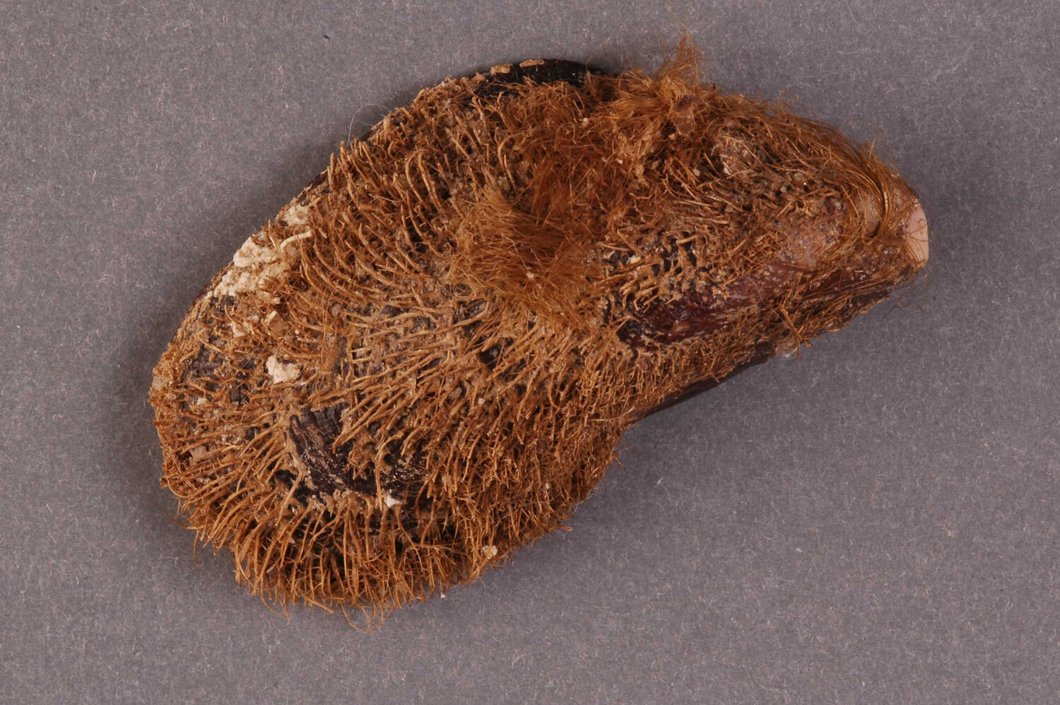 Shells of this species are dark brown with an exterior sculpture of fine radial lines (striae) and distinctive outer coating (periostracum) of long, barbed, coarse hairs. Shell up to 6 cm across.