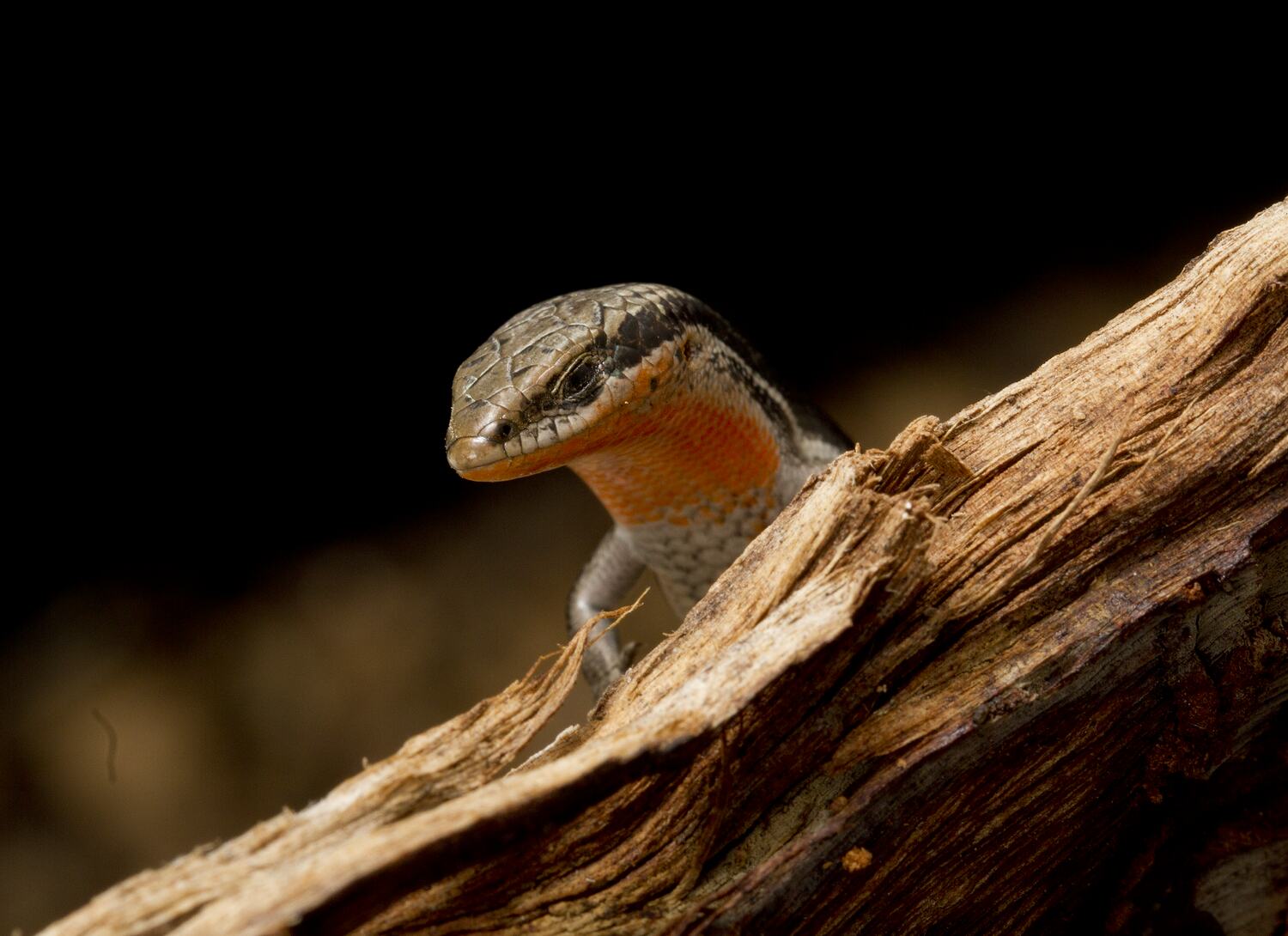 A small skink with grey body, orange-red throat, black wide lateral stripe.