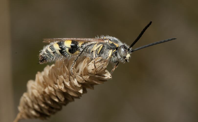 This family of wasps occurs around the world. Two main groups of Hairy Flower Wasps are seen in Victoria, Austroscolia soror and Campsomeris which occur in similar habitats. Like most insects that visit flowers, adult Hairy Flower Wasps drink nectar. Nectar provides them with food energy in the form of sugars that they use to power their wing muscles. Flower wasps are frequent visitors to flowers and due to their size and colour, are extremely obvious when drinking nectar. They are often seen visiting compost heaps or wood piles or flying around the dead stump of a tree. Adult females are large and powerful wasps and are quite capable of digging into compost heaps or saw-dust of a tree stump to find scarab beetle grubs (such as the Christmas Beetle group). Having located a beetle grub, the female stings and lays an egg inside it. The sting from the wasp does not kill the beetle grub but only paralyses it. There is a good reason why the female wasp does not kill the beetle grub. If the sting were to kill the beetle grub, then its tissue would immediately start to rot and decompose. When the wasp egg hatches inside the paralysed beetle grub it is surrounded by living tissue - the food that it needs to eat. The developing wasp larva knows which parts of the beetle grub to eat first to prolong the grub's life for as long as possible; thus maximizing the chances of complete development of the wasp larva. This behaviour makes these flower wasps parasitoids rather than parasites because the host is slowly killed. Parasites do not usually kill their host. Many species of wasps are parasitoids but others, such as paper wasps, kill their prey immediately. Flower wasps are solitary and do not make a nest or form a colony. If you see several flying around a compost heap or tree stump it simply means that several wasps have found the area.