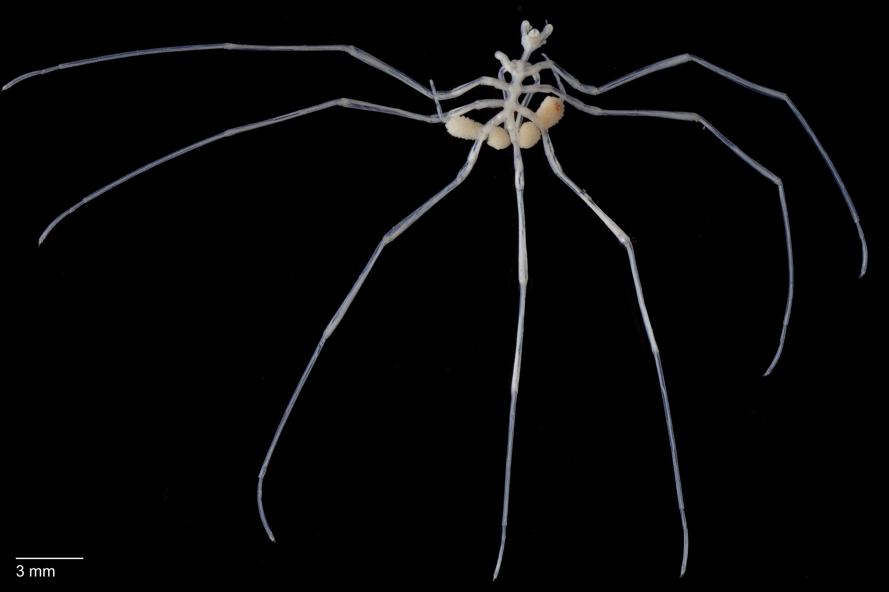 These well-camouflaged sea spiders are typically found on top of sponges with their legs spread apart. They have crimson red egg masses, but other colours may occur like they do in other species. They feed on small polychaete worms. Males carry the eggs, holding them between body parts called ovigers that hang under the animal.