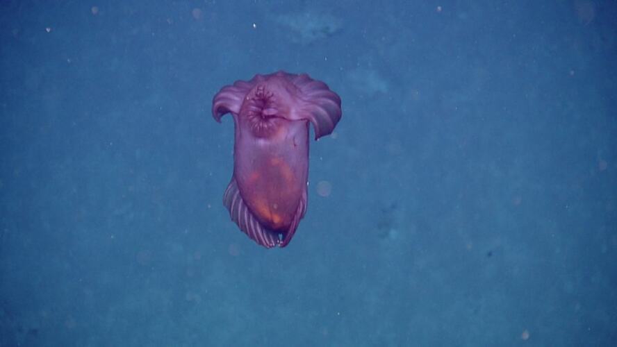 Typically pink, purple or reddish brown, Enypniastes exima is also somewhat translucent, making it easy to see the coiled gut with its sediment ballast through the body wall. A bentho-pelagic species, it is usually seen floating above silty/ sandy seafloors, but descends often to feed briefly on 'marine snow', organic particles which have floated down from above and now sit on top of the sediment. It has been observed to 'poop' before take-off to reduce excess weight, leaving behind a cleaned, aerated cast of sediment. This important ecological process of turning ocean sediment, similar to an earthworm on land, is known as 'bioturbation'.