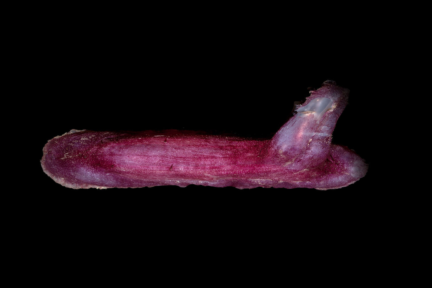 Purple to violet; soft, gelatinous, roughly cylindrical, flattened ventrally with anterior brim; ventral mouth and anus; large, unpaired sail-like dorsal appendage towards posterior of body; 18 tentacles with firm discs and knobbed margins; minute venterolateral tube feet, paired rows of larger mid-ventral tube feet; thin, paired dorsal papillae; ossicles arched crosses with spines; up to 32 cm long with dorsal appendage up to 12cm .