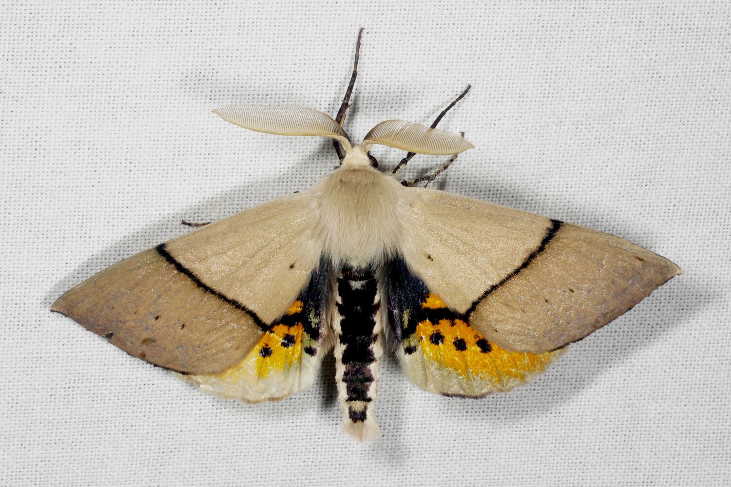 Comparatively large, cream-coloured moth with a distinctive transverse line across forewing and a large orange and purplish-black patch on underside of forewing.