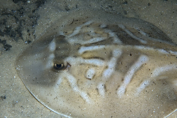 This species is common in coastal waters and is often seen foraging over sand flats and seagrass beds feeding on fishes and invertebrates. Females give birth to up to six live young which develop inside their mother in eggs and hatch before birth. Birth is usually in the autumn after a gestation of 12 months. Southern Fiddler Rays are taken as bycatch in commercial trawls and sold in small quantities. Intermediate in appearance between sharks and rays, these are primitive rays as their gill slits are positioned on the underside of their disk like head. Their tropical relatives are even more shark-like in having better defined pectoral fins. Trygonorrhina dumerilii is easily confused with Trygonorrhina fasciata which is very similar in appearance but occurs only along the east coast.